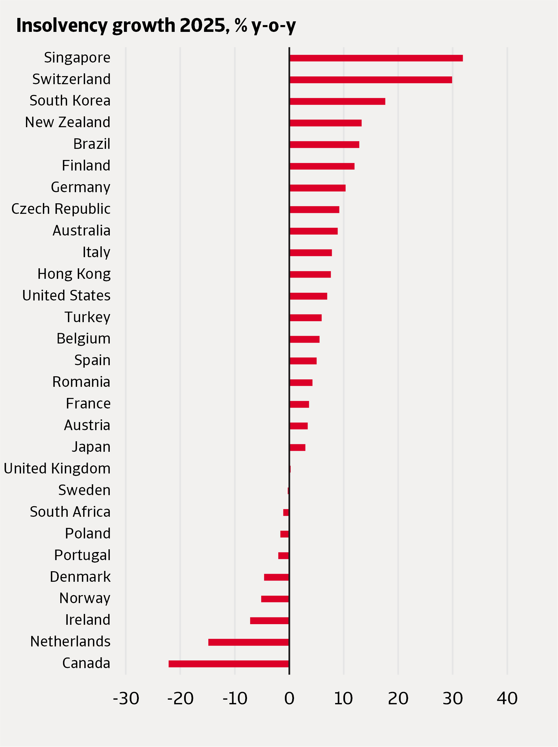 In several European countries, 2025 marked a turning point, with insolvencies no longer rising but starting to decrease. This was especially pronounced in Ireland and the Netherlands. Economic growth was strong in Ireland, which supported corporate recovery. In the Netherlands, a legal framework that was introduced in 2021 makes it easier for companies to restructure and settle their debts without entering a bankruptcy procedure. As a result, more Dutch firms chose to close without formal insolvency proceedings, and total company closures increased in 2025. Insolvencies in Norway, Portugal and Poland also fell slightly in 2025. Macroeconomic conditions were favorable in Norway and, while some sectors faced financial difficulties such as construction and hospitality, others performed particularly well, including energy and oil services. Insolvencies in the UK remained stable in 2025 after a slight decrease in 2024.