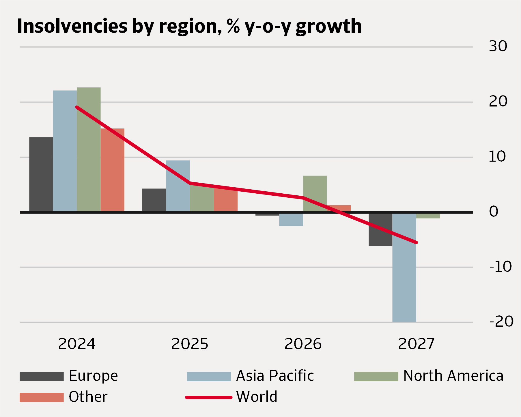 Globally, our expectation is that insolvencies will grow moderately by 3% in 2026, with signs of normalization to lower levels generally starting in the second half of 2026. This is a 6 percentage points upward revision compared to our October 2025 Insolvency Outlook, when we expected that insolvencies will start normalizing from early 2026.