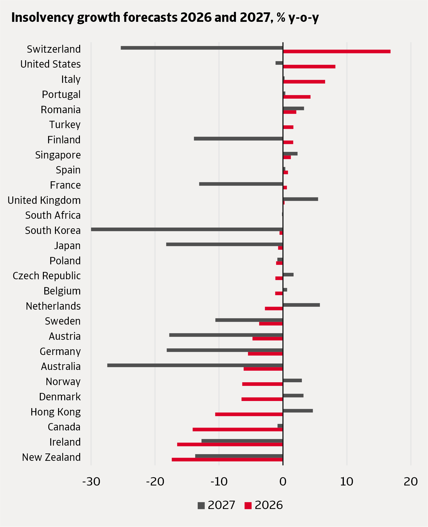 Europe presents a mixed outlook in 2026, with some countries still experiencing increases in insolvencies, while others experience a decrease in insolvencies. We expect the highest increases to occur in Switzerland, Italy and Portugal, while the most significant decreases are likely to occur in Ireland, Denmark and Norway.