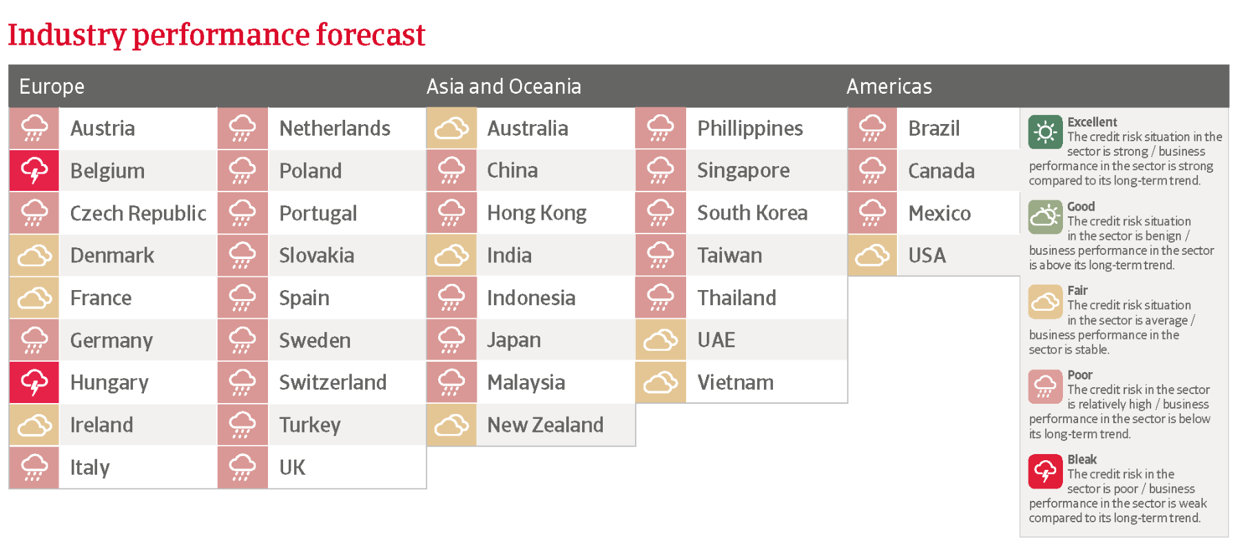 The credit risk situation of the industry remains strained, as subdued demand, elevated energy costs, and low sales prices have deteriorated margins. Payment delays and insolvencies have increased over the past year, and the situation will remain tense in the coming months. Mainly in focus are automotive suppliers and highly geared companies.
